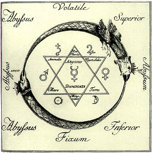 Nell’antica alchimia Il “Serpens qui caudam devorat”, talvolta è raffigurato metà bianco e metà nero, cioè come lo Yin e lo Yang, simboli della tradizione del Taoismo cinese, che riportano alla conflittualità degli opposti ed al loro reciproco interagire. Le due componenti della Materia, maschile e femminile, rappresentate rispettivamente in alchimia dallo Zolfo e dal Mercurio, nella rappresentazione delle nozze alchemiche, realizzano quel “Filius philosophorum”, l’Androgino, come prodotto dei due principi, o cosa doppia (Rebis).